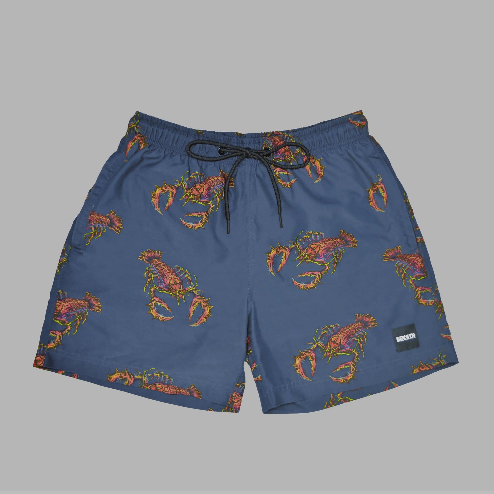 Gray beach shorts with lobster prints.
